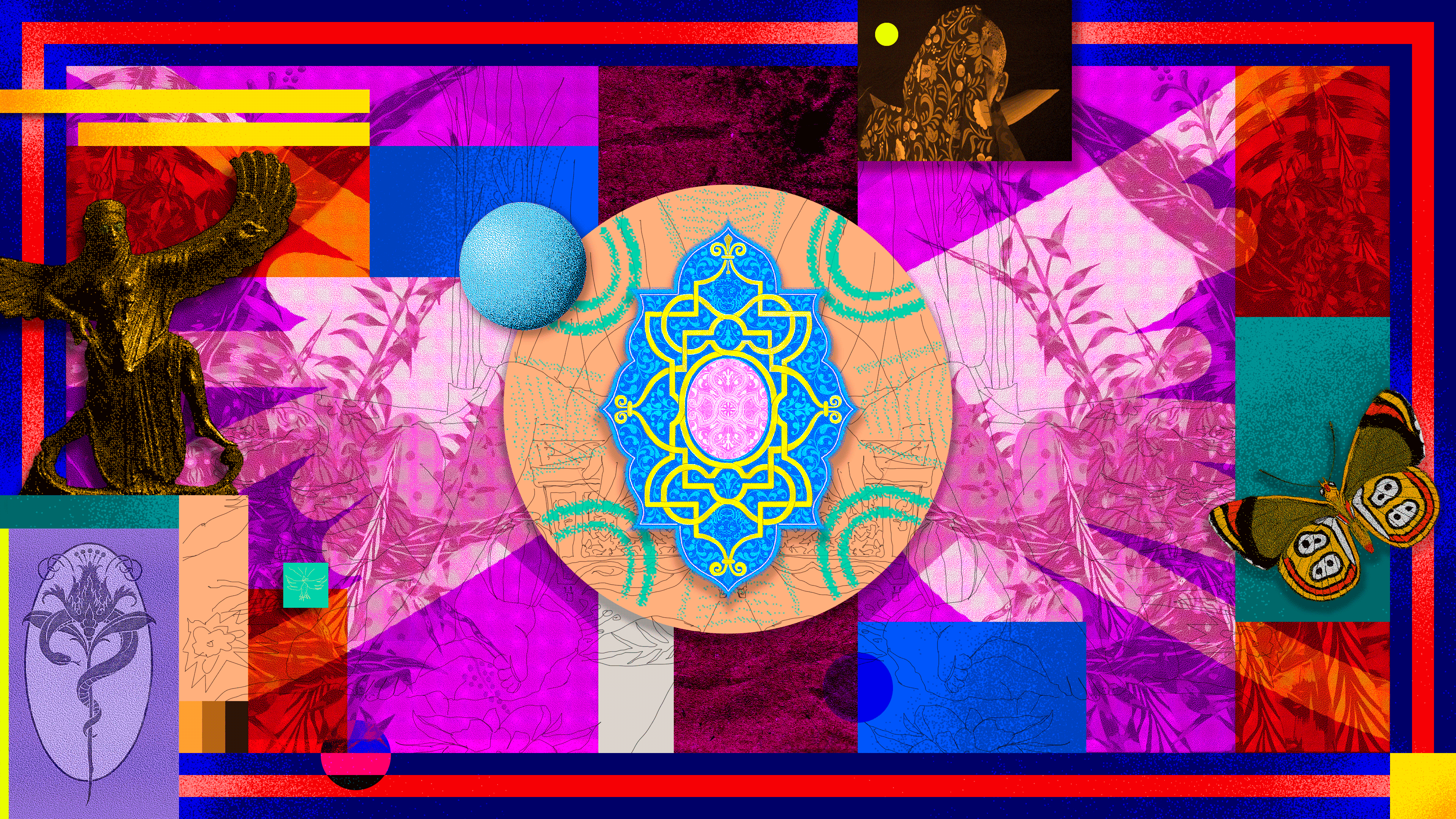 In Search Of The Absolute combines the imagery of praying religious statuaries, soviet space propaganda, 18th-century drawings of beggars by Goya, commercial illustrations, and surreal Persian miniatures effectively uncovering a multitude of shared themes and symbols of faith, life, and ideas of an afterlife. These varied symbols point inwards and outwards, questioning and revealing the primal search for meaning and logic in life.